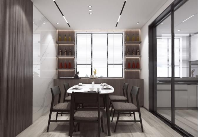 儲物餐邊柜,木飾面加大規(guī)格巖板背景,實現(xiàn)裝修內(nèi)容主次分明,有詳有簡。