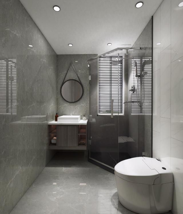 主衛(wèi)選用灰色全拋釉瓷磚進行大面積鋪貼,小面積用白色瓷磚切割作為背景,起到整個空間的點睛之筆。